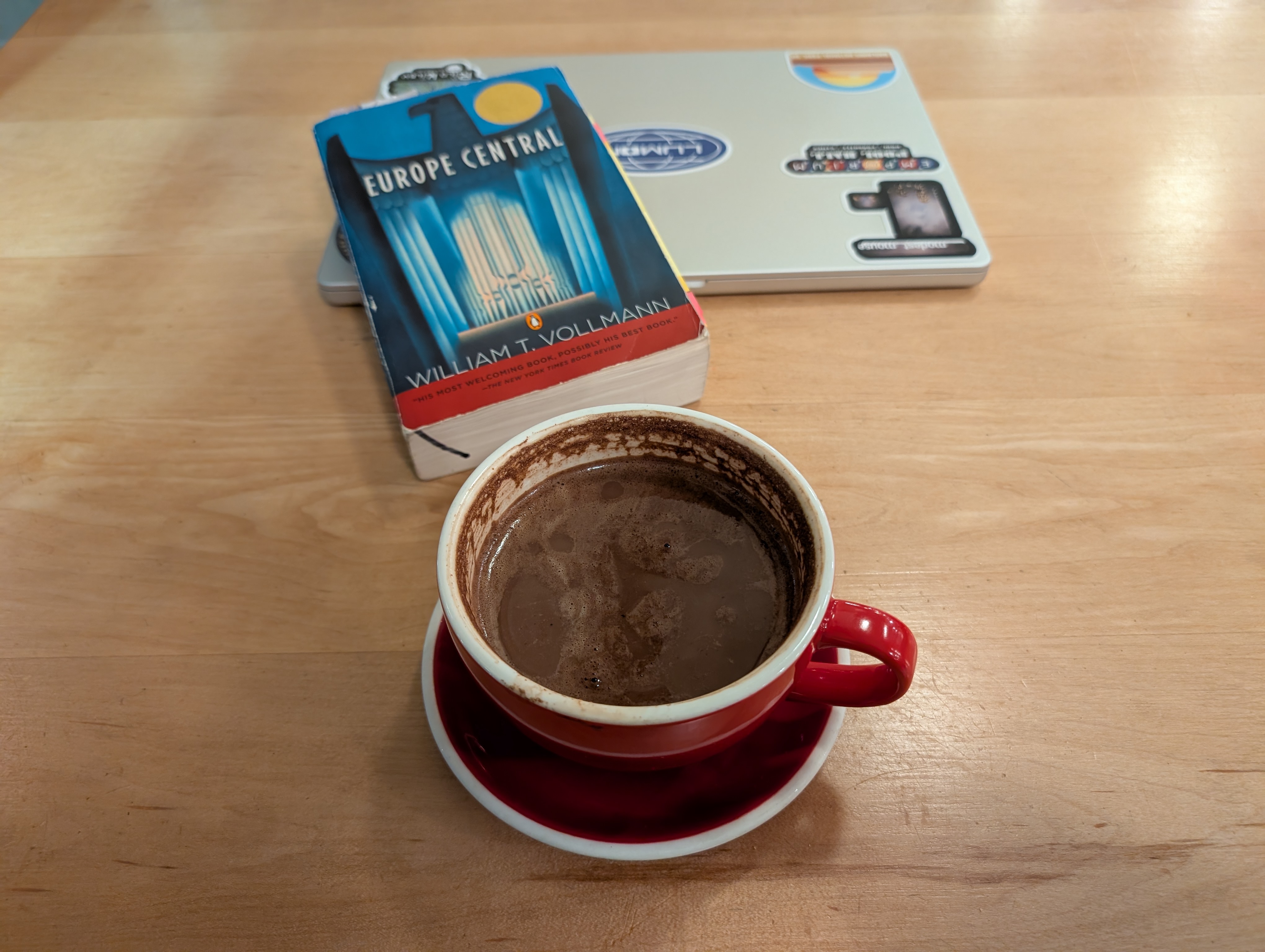 A brief update from the coffee shop, brought to you by the spiced hot chocolate I’m enjoying along with William T. Vollmann’s Europe Central. Except “enjoying” might apply only to the beverage. Just 128 pages in, reading a doorstop of a novel about the lives of various people in the USSR and Nazi Germany, unwittingly (sometimes wittingly) caught up in and worn down by their nations’ civil upheaval, hubris, paranoia, and eventual terroristic despotism, is starting to feel a bit masochistic, considering the climate I currently find myself in.